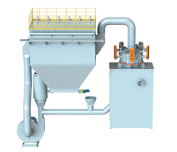 開(kāi)路系統(tǒng):物料通過(guò)給料機(jī)定量進(jìn)入進(jìn)料管道,與系統(tǒng)進(jìn)風(fēng)混合均勻后,由下端入料口進(jìn)入分級(jí)機(jī),符合粒徑要求的細(xì)顆粒隨氣流進(jìn)入脈沖收集器,粗顆粒夾帶部分細(xì)顆粒沿筒壁下降至二次風(fēng)處,經(jīng)二次風(fēng)的淘洗作用,使粗細(xì)顆粒分離,細(xì)顆粒上升至分級(jí)區(qū)進(jìn)行二次分級(jí),粗顆粒下降至下料口排出。